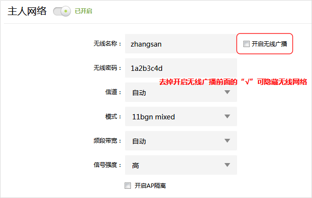 [3] 隐藏无线网络。隐藏网络后,别人就搜不到你的无线信号,降低了被蹭网的风险。登录到路由器管理界面,点击 路由设置 >> 无线设置,把 开启无线广播 前面的勾去掉,点击 保存后,信号就“隐藏”了。