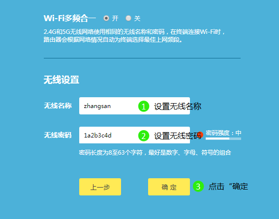 根据检测到的上网方式,填写该上网方式的对应参数。本例中检测到宽带为拨号上网,输入宽带运营商提供的宽带账号和宽带密码。
