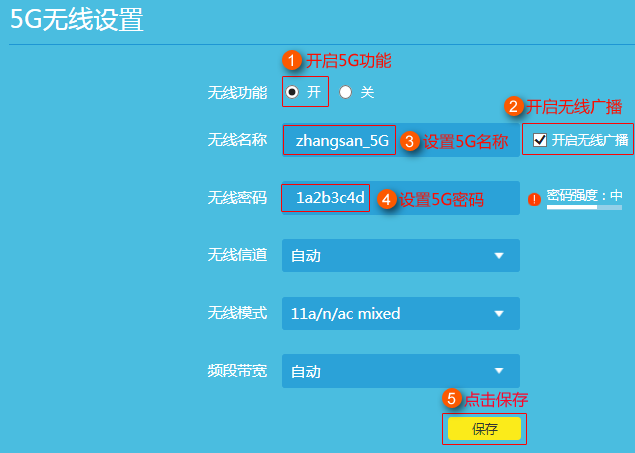 以上设置中无线信道、无线模式、频段带宽保持默认即可。设置完成之后,如果您的无线终端支持5G频段,便可以搜索到5G信号名称连接上网了。