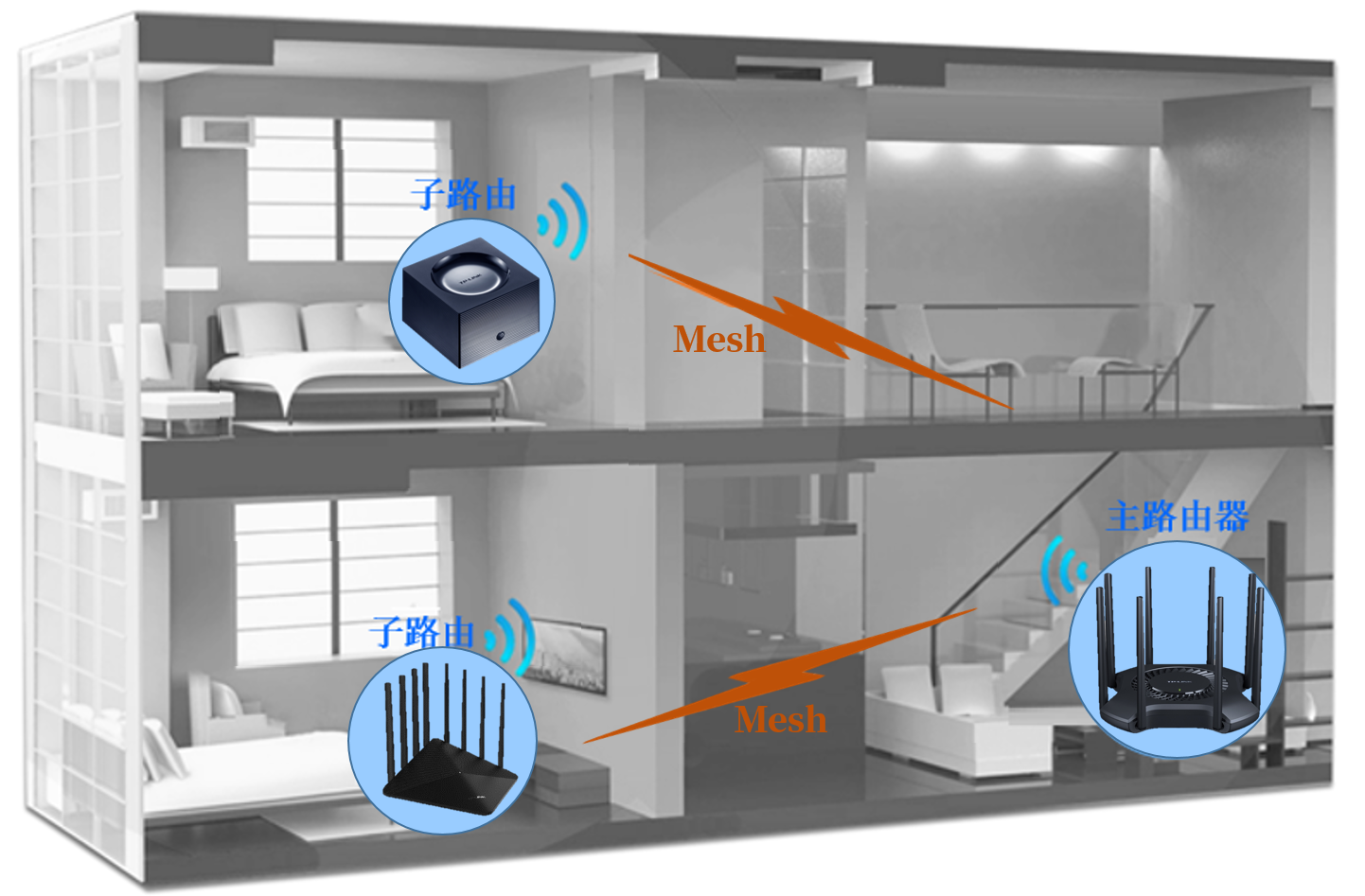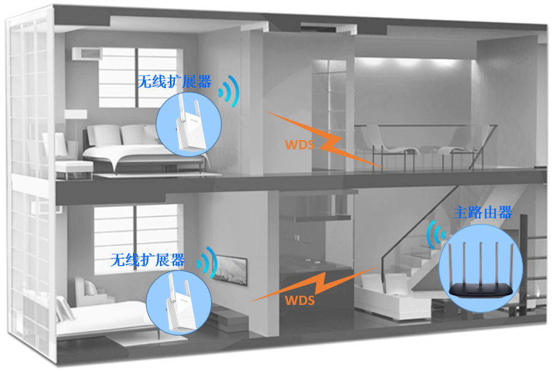 对于复式楼房(上下两层,多个房间),由于隔墙、障碍物会导致无线信号衰减,降低无线传输速率,可能会导致单台无线路由器无法完整的覆盖整个区域。