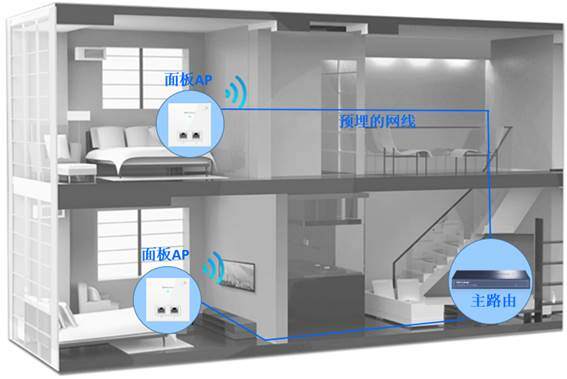 使用面板式AP的方式组网,实现全方位无线覆盖。面板AP方案,是由一个主路由和多个面板AP组合而成,主路由器与面板AP之间通过家里预埋的网线传输信号, 面板AP可直接替换家里原有网络面板,无需重新布线,不破坏原有装修。