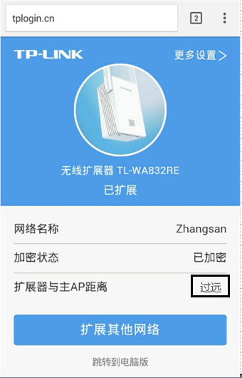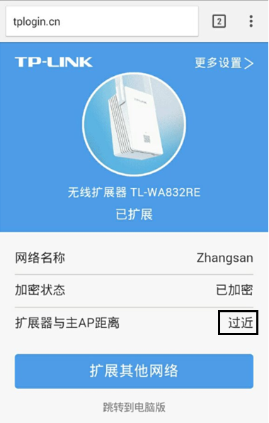 进入扩展器的管理界面,可以看到具体太近或太远的提示,如下: