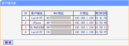 如果登录到路由器的管理界面,点击管理界面的 DHCP服务器 > 客户端列表,可以查看到扩展器的IP地址,如下图: